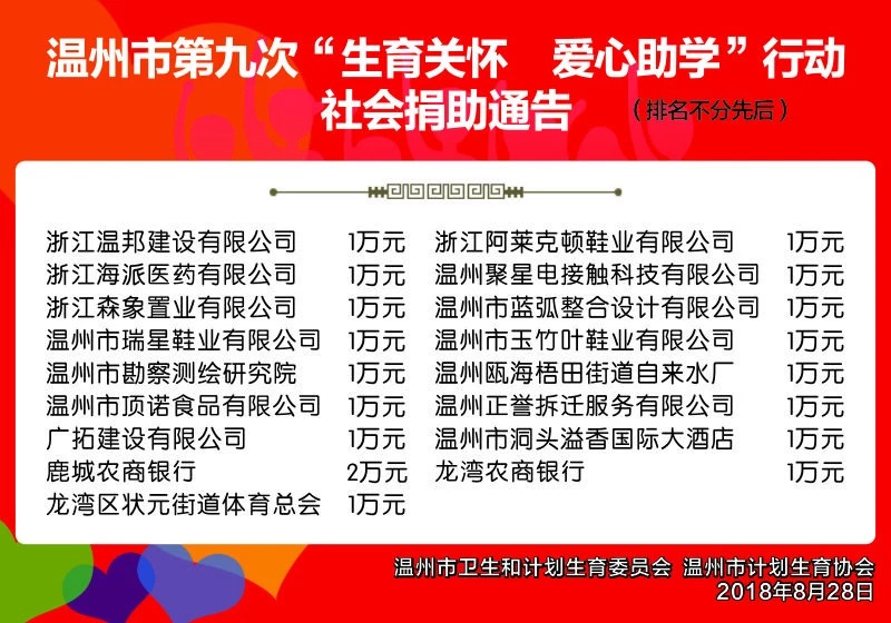 活動現(xiàn)場,主辦方向浙江海派醫(yī)藥有限公司等11家捐助企業(yè)獻上愛心企業(yè)牌子,并表示了對助學活動支持的感謝之意;6名女高中新生和23名女大學生新生,在開學即將來臨之際,每人拿到2000元和4000元助學金。此外,浙江省馬寅初人口福利基金會向溫州第九次“生育關(guān)懷 愛心助學”活動捐贈助學金44.3萬元。