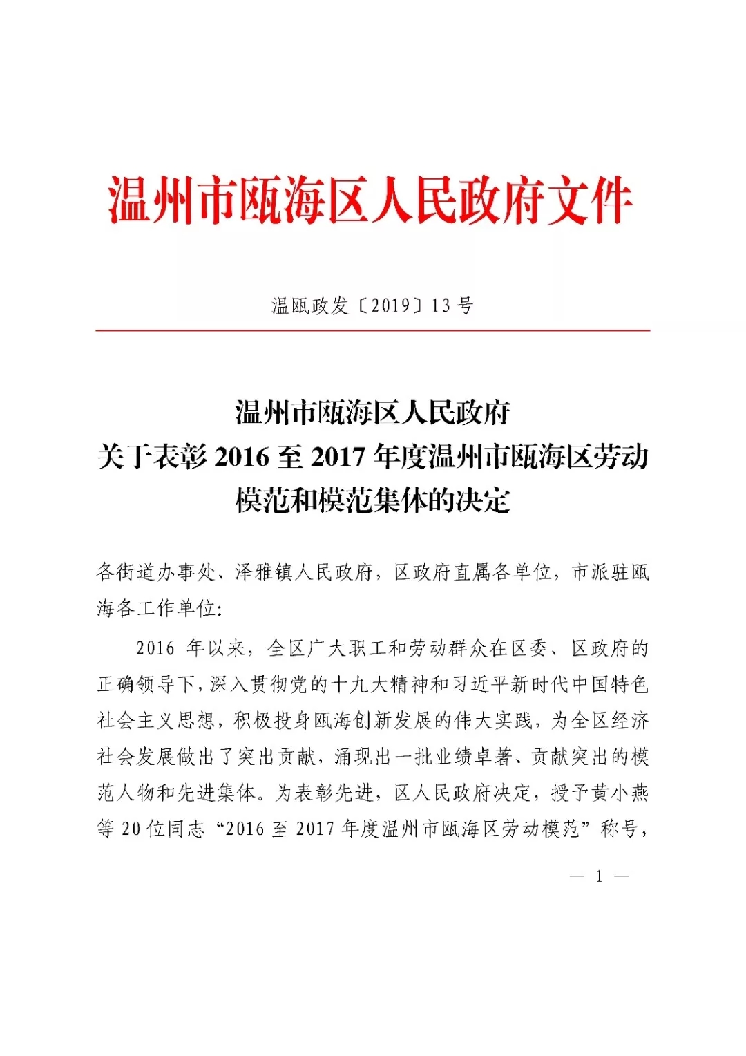 3月30日,甌海區(qū)人民政府發(fā)布溫甌政發(fā)(2019)13號(hào)文件對(duì)2016-2017年度區(qū)勞動(dòng)模范及模范集體進(jìn)行表彰。浙江海派醫(yī)藥有限公司因業(yè)績(jī)卓著、貢獻(xiàn)突出成為受表彰的五個(gè)集體之一。