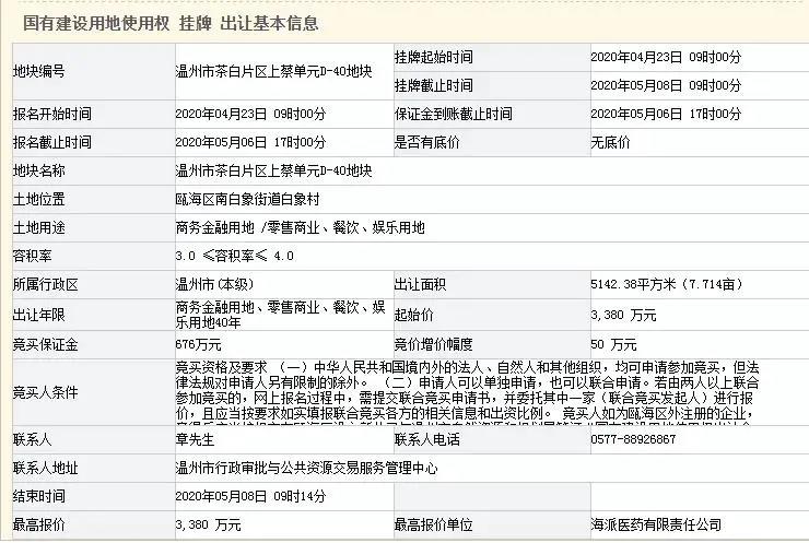 4月2日,溫州市自然資源與規(guī)劃局掛牌出讓溫州市茶白片區(qū)上蔡單元D-40地塊。5月8日,海派醫(yī)藥有限責任公司成功摘牌該地塊。該地塊出讓起始價3380萬元,出讓面積5142.38平方米。