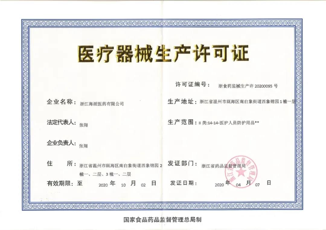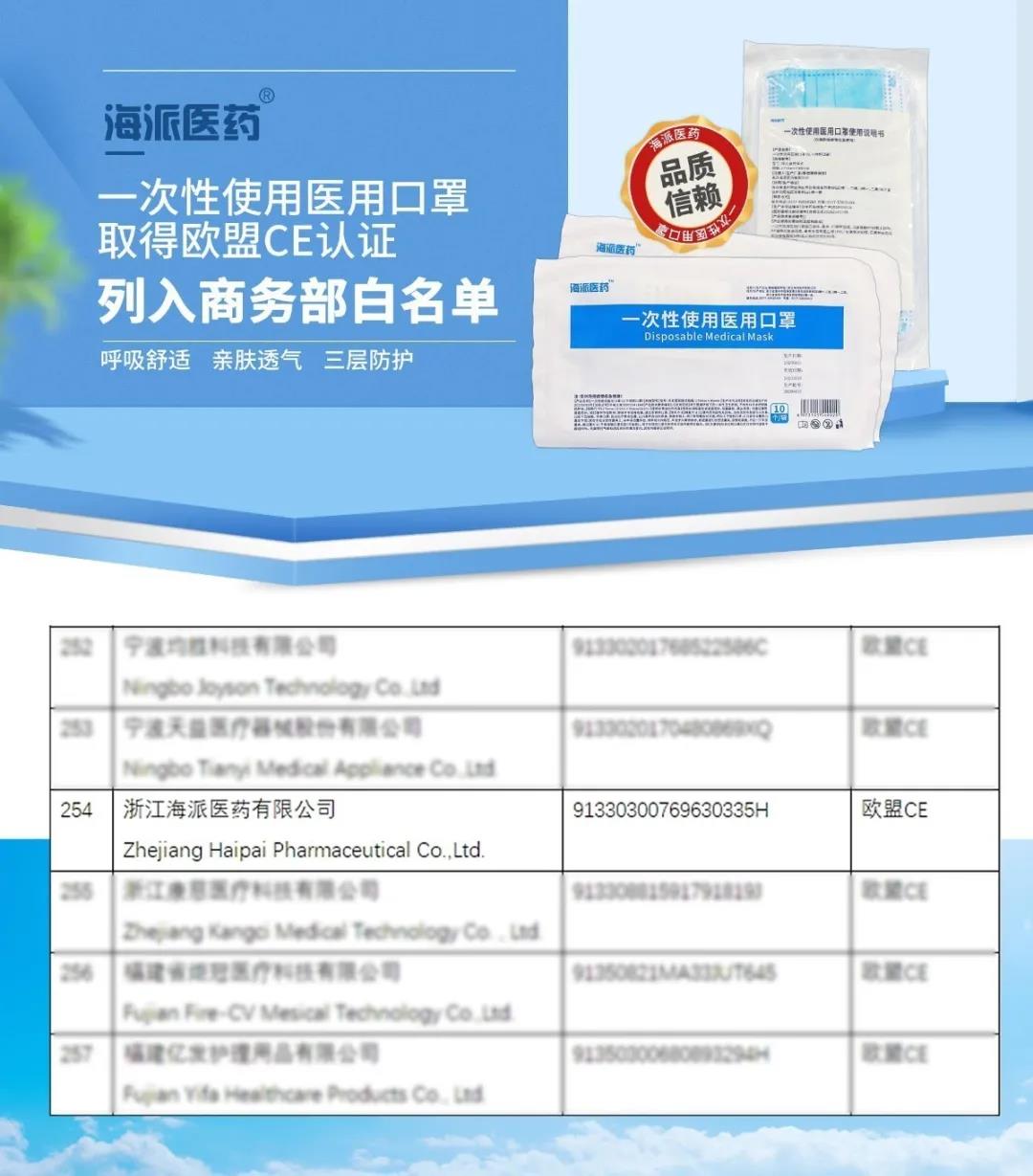 The disposable medical masks of “Haipai Pharmaceutical” are produced strictly according to the national and group standards including GB/T 32610-2016, GB 2626-2006, YY/T 0969-2013 and T/ZFB 0004-2020 as well as EU and EN 14683 test standards. All of the company’s products are qualified according to the detection of testing units with CNAS and CMA authorization and authorized agencies of EU test standards. Meanwhile, we have acquired EU’s CE certification , and entered the “white list” of the Ministry of Commerce.