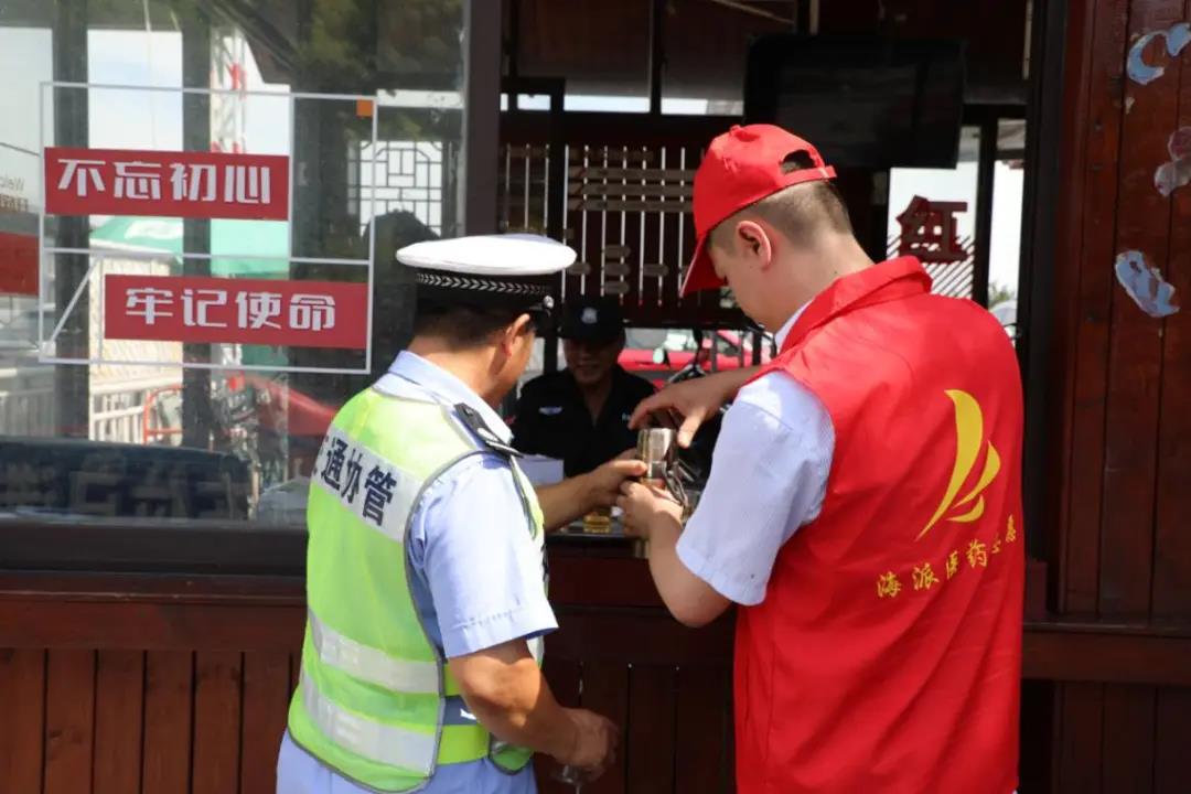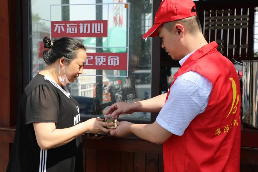 來(lái)自海派醫(yī)藥的黨員志愿者頂著炎熱的陽(yáng)光,站在街頭為往來(lái)的家屬病患以及行人們親手遞上解暑茯茶,減輕夏日的燥熱,并為廣大群眾免費(fèi)提供口罩、風(fēng)油精、紙巾等物品。火紅的馬甲、熱情的服務(wù),儼然成為這個(gè)夏日最亮麗的一道“紅色風(fēng)景線”。